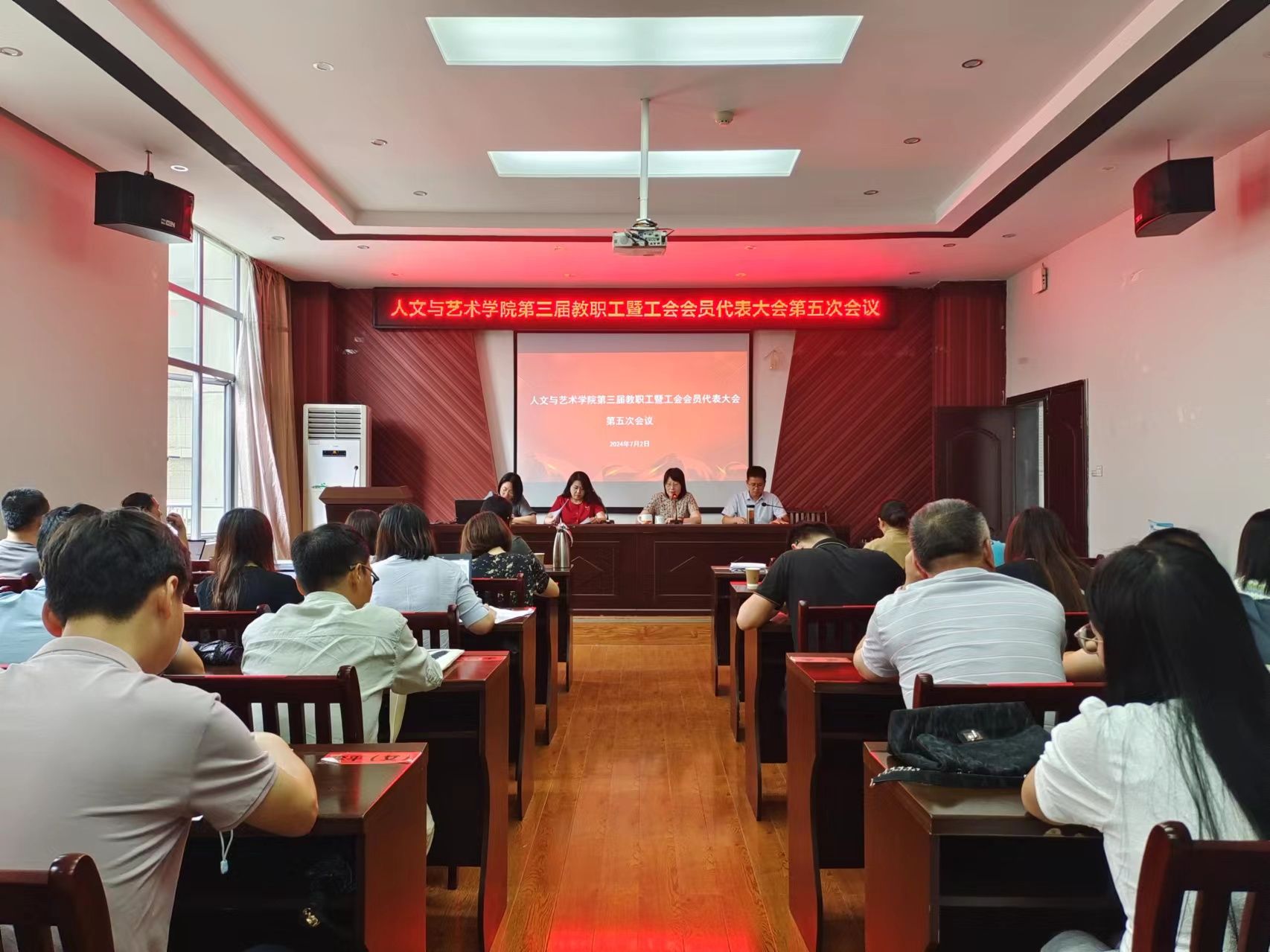 7月2日下午,人文与艺术学院在艺术楼A230召开第三届教职工暨工会会员代表大会第五次会议。会议由学院党委书记张朝霞主持,学院领导班子成员、全体教职工参会。