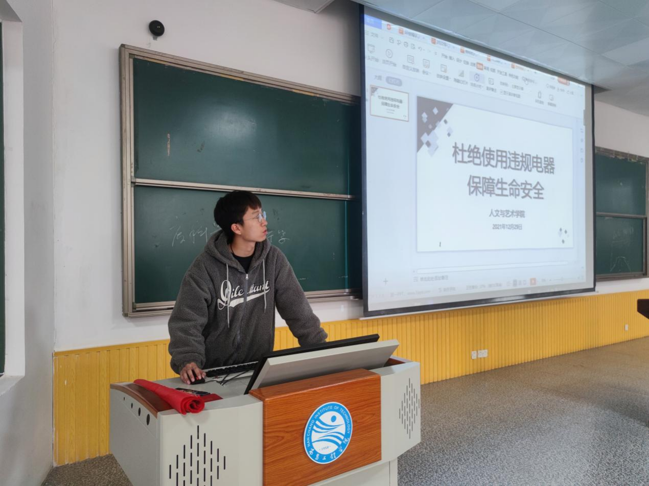 天气的进一步转冷,冬季因用电安全而出现的事故也随之增加,为进一步提高我院学生安全用电意识,规范学生宿舍用电行为,防范宿舍安全事故的发生,人文与艺术学院于2021年11月24日中午在教学南大楼C105开展了“杜绝使用违规电器,保障生命安全”主题教育活动,人文与艺术学院团委副书记丁蓓蒂出席此次会议,全体学生干部参加。