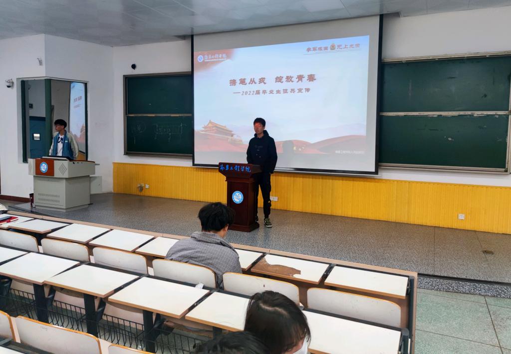 为鼓励学生积极参与应征入伍,提高兵员征集质量,推进国防和军队现代化建设。人文与艺术学院于11月10日在南C105开展“2022届毕业生征兵宣传”活动。全体学生干部和2022届毕业生到场参与。