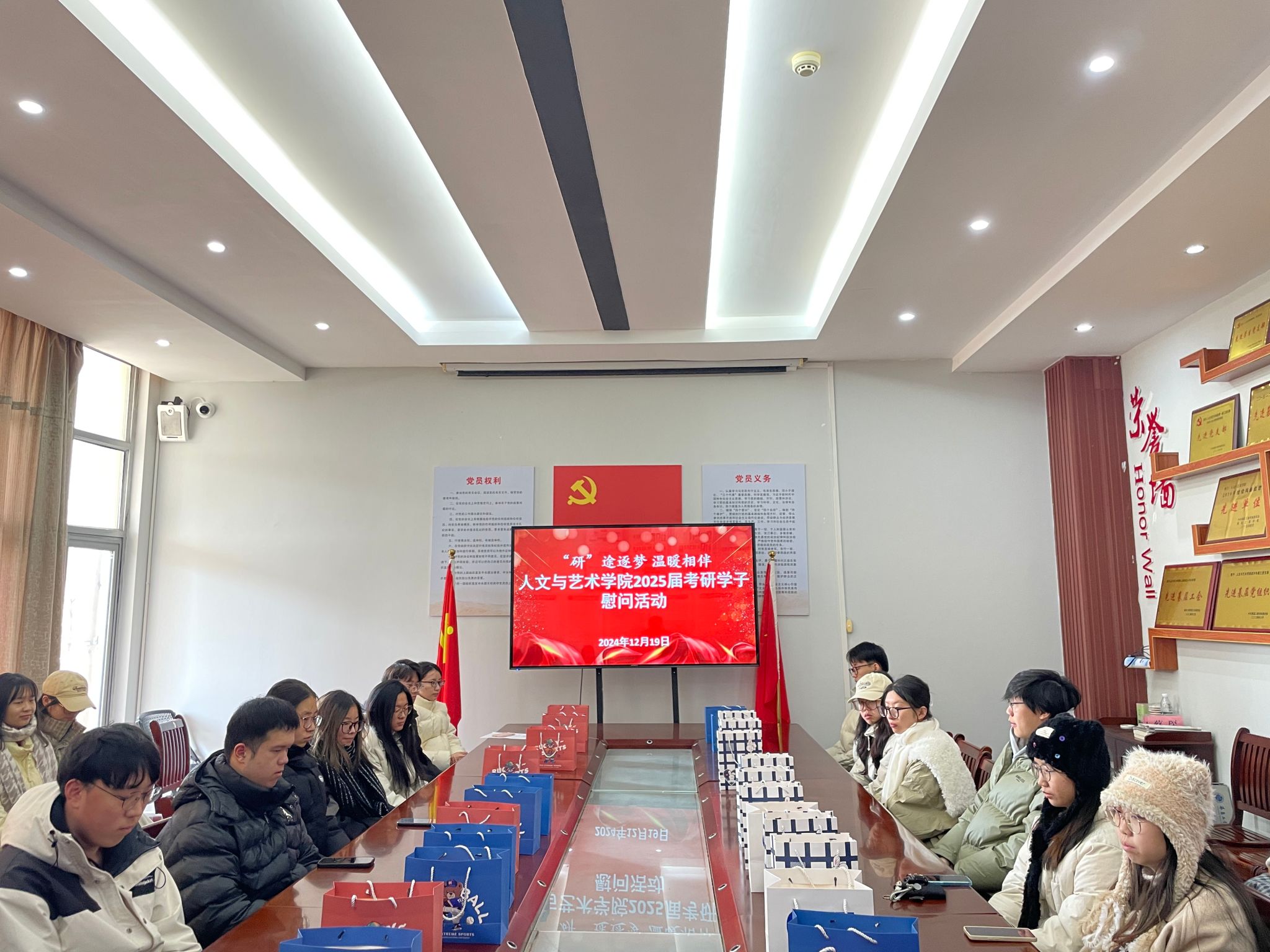 在 2025 年考研即将来临之际,为鼓舞考研学子士气,增强他们的备考信心,12月19日中午,人文与艺术学院精心组织了“研”途逐梦,温暖相伴” 2025 届考研学子慰问活动。学院领导班子成员、全体辅导员出席活动,为考研学子们送去关怀与鼓励。