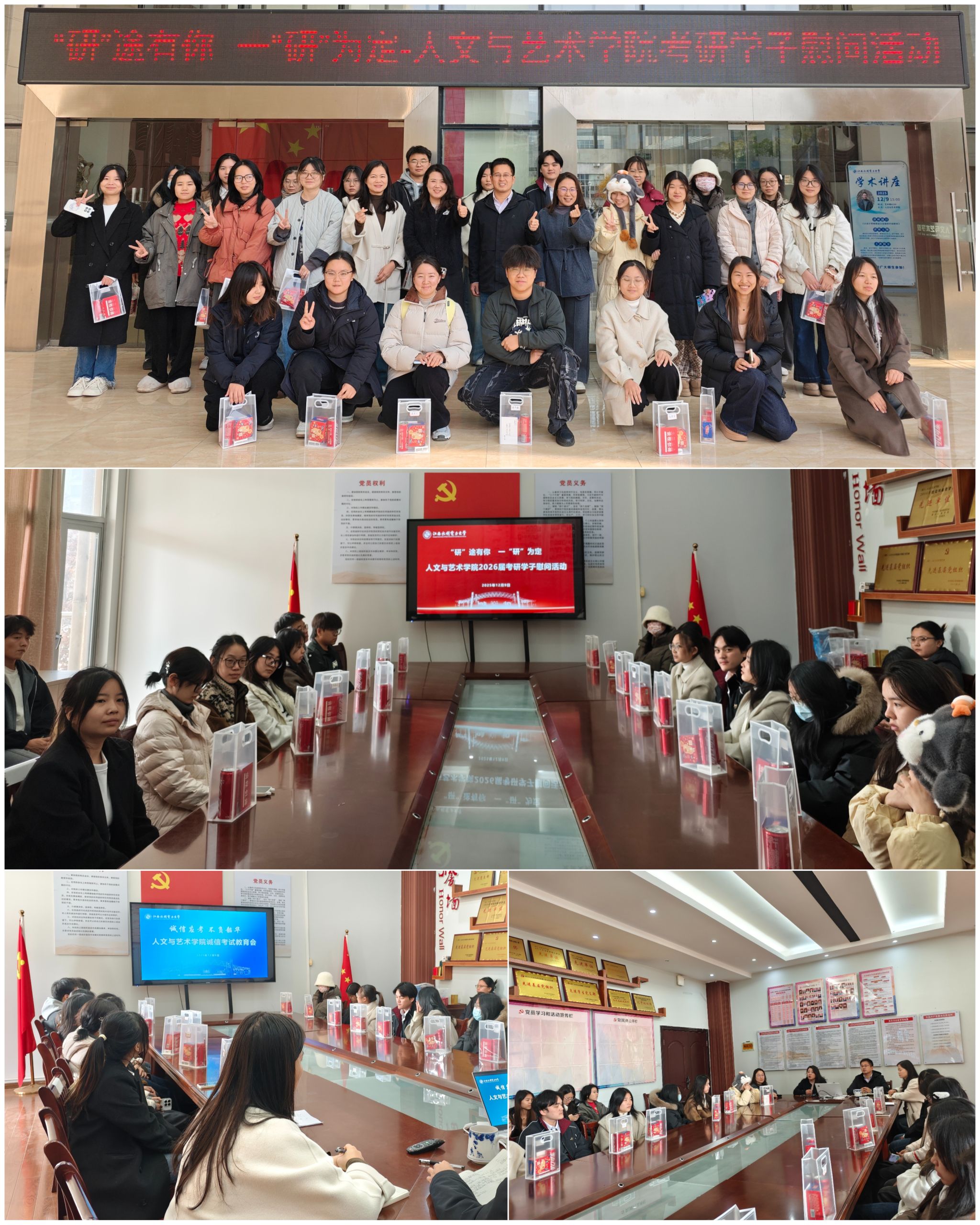 12月9日,人文与艺术学院在艺术楼A231会议开展“‘研’途有你 一‘研’为定”2026年考研慰问暨诚信考试教育活动。院长万芬芬、院党委副书记黄海平,学科与科研办、学工办负责同志,辅导员和考研学生代表参加活动。