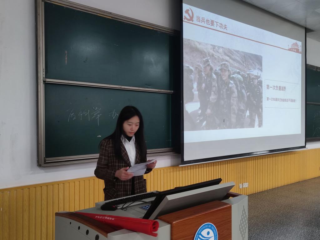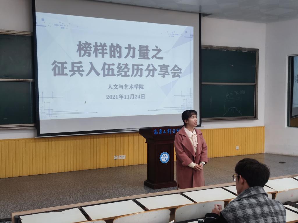 人文与艺术学院于11月24日中午在教学南大楼C105开展了榜样的力量之征兵入伍经历分享会,出席此次活动的有人文与艺术学院团委副书记丁蓓蒂、退伍军人代表邱俊椿,全体学生干部及有意向入伍的学生参加。