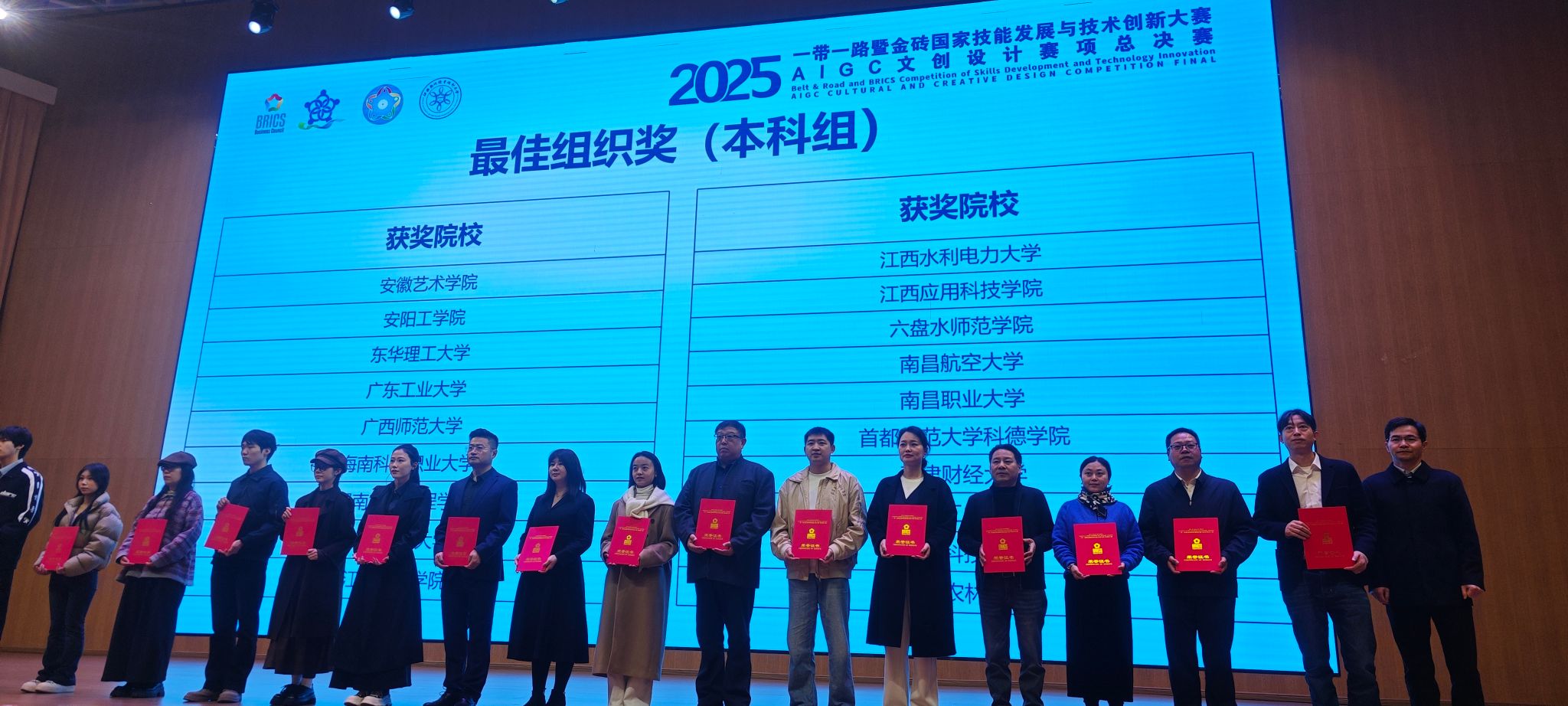 12月21日,2025一带一路暨金砖国家技能发展与技术创新大赛AIGC文创设计全国总决赛在江西井冈山圆满落幕。我校代表队共斩获全国总决赛奖项4项,其中一等奖1项、二等奖1项、三等奖2项,学校获评“优秀组织奖”,充分体现了我校在AIGC文创设计领域的教学水平与人才培养成效。