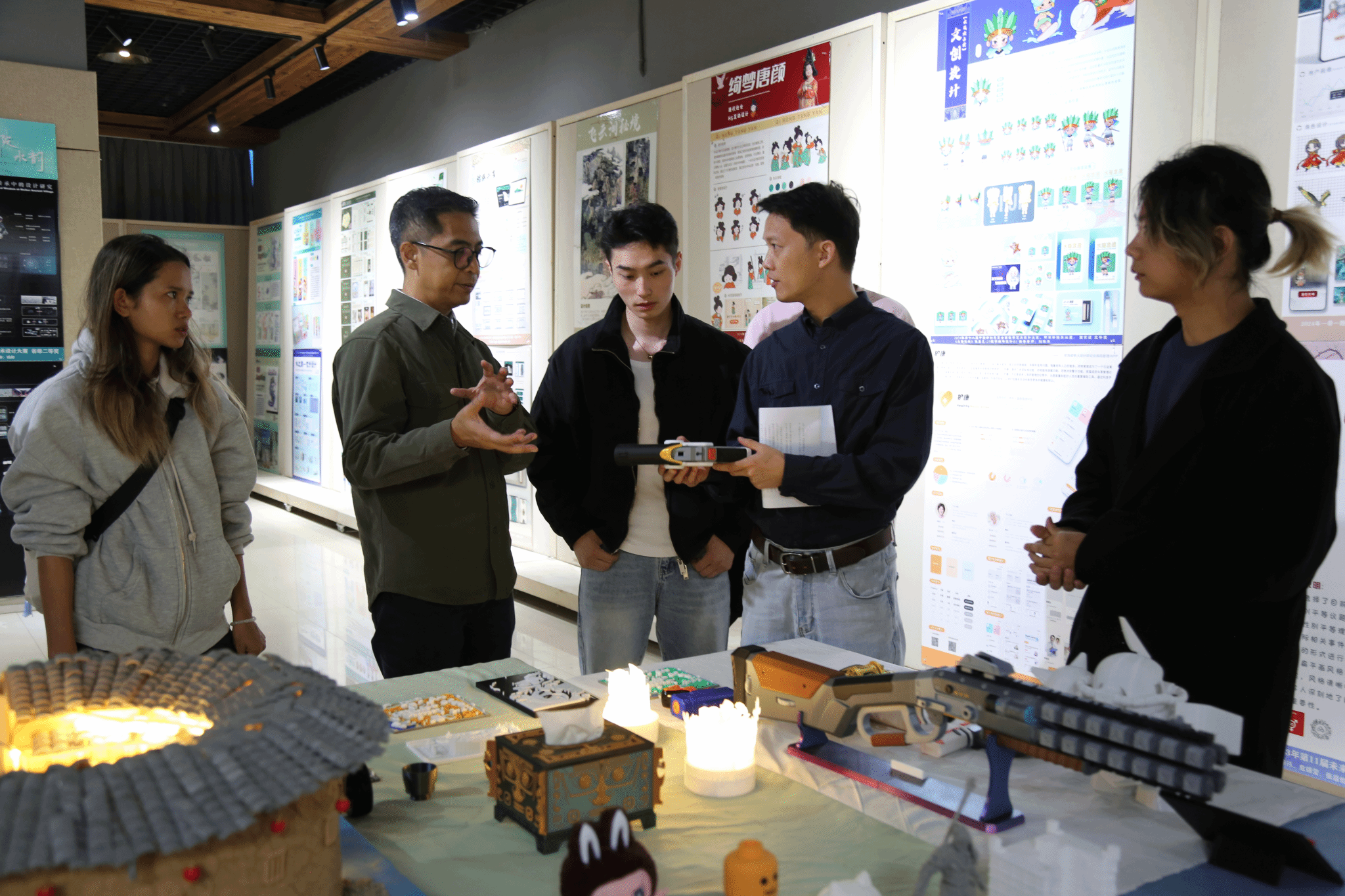 活动伊始,代表团在学院师生陪同下走进人文与艺术学院美术馆(展厅)。展厅内一侧集中陈列我院硕士生和本科生学生获奖作品。其中,全国书籍装帧设计大赛国赛一等奖《十三种闻树的方式》等作品,以新颖的新媒体技术融入书籍装帧设计,打破了传统设计的边界,引发了中泰青年学生的热烈讨论和交流。