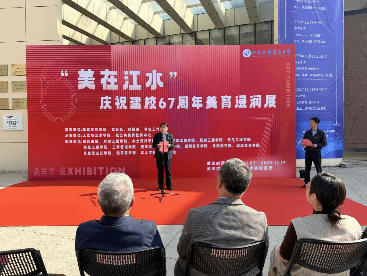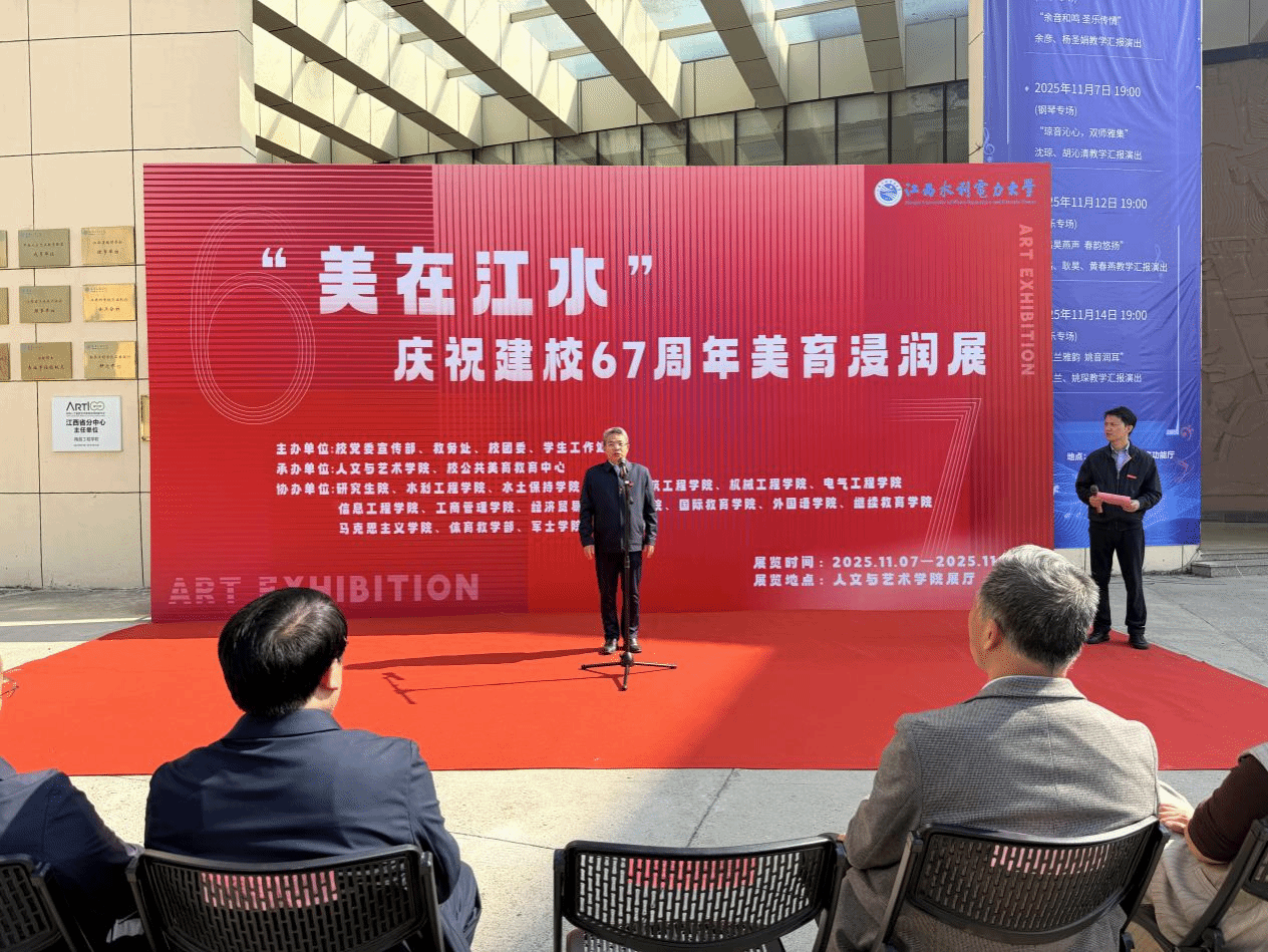 11 月 7 日,“美在江水 —— 庆祝建校 67 周年美育浸润展” 在人文与艺术学院展厅开幕。校党委委员、纪委书记殷安全宣布展览开幕,校党委委员、副校长周仲魁为展览致辞,展览主办、承办单位等负责人参加了开幕式。