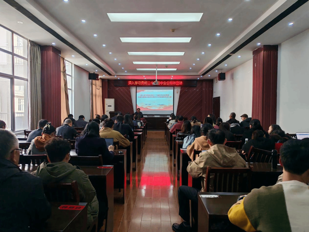 根据学校党委统一安排,2025年11月25日下午,学习贯彻党的二十届四中全会精神宣讲会在艺术楼A230举行。宣讲团成员、科技处处长邓承志以《深刻学习贯彻党的二十届四中全会精神——为奋力谱写江西水利电力大学新篇章贡献力量》为题,开展党的二十届四中全会精神专题宣讲,会议由学院院长万芬芬主持,师生代表90余人现场聆听。