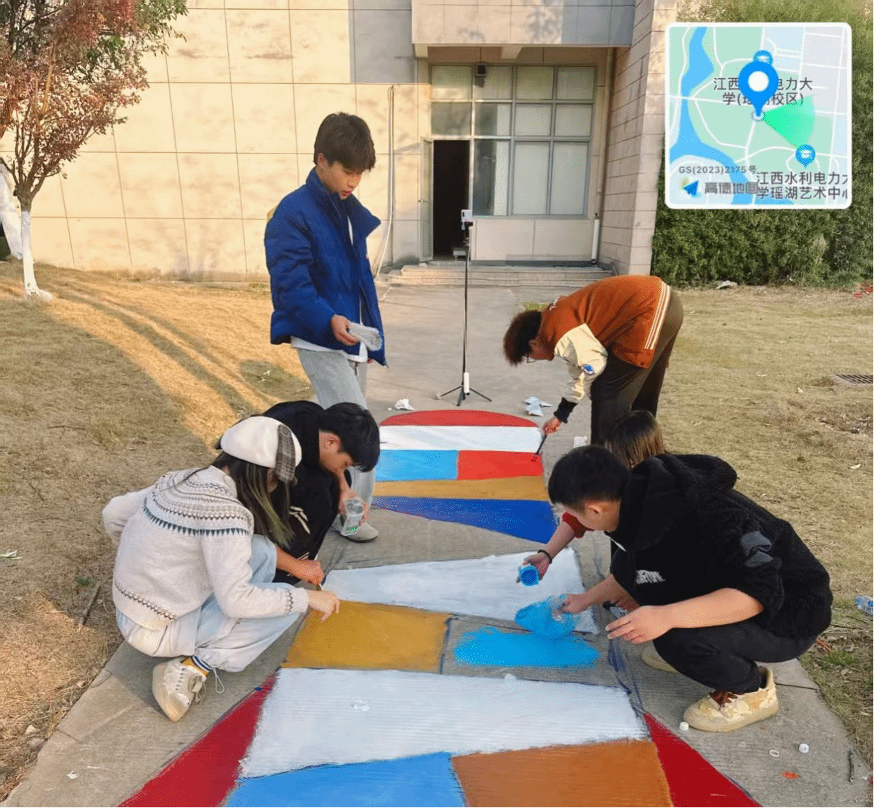 活动当天,志愿者们规划了地绘主题:图书馆区域以“阅读·求知”为核心,绘制了翻开的书本、跃动的文字等图案,呼应书香氛围;艺术楼周边则围绕“创意·美学”,设计了抽象艺术元素与专业符号结合的画面。大家分工协作,从打稿、调色到填色,路过的师生纷纷驻足点赞,不少同学还主动加入帮忙传递工具、清理现场。