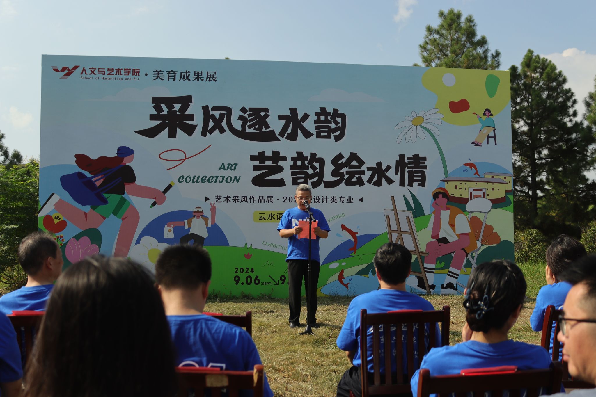 9月6日上午,“采风逐水韵 艺韵绘水情”美育成果展暨迎新系列活动开幕式在艺术楼南面草坪举行,校党委书记汪胜前,校纪委书记殷安全,副校长周敏丹、张兴旺,校党委委员、组织部部长阳子龙,校党委委员、宣传部部长洪恩强,校党委委员、统战部部长、学工部部长熊涛以及相关职能部门负责人、人文与艺术学院领导班子、教师代表、学生代表共100余人参加。
