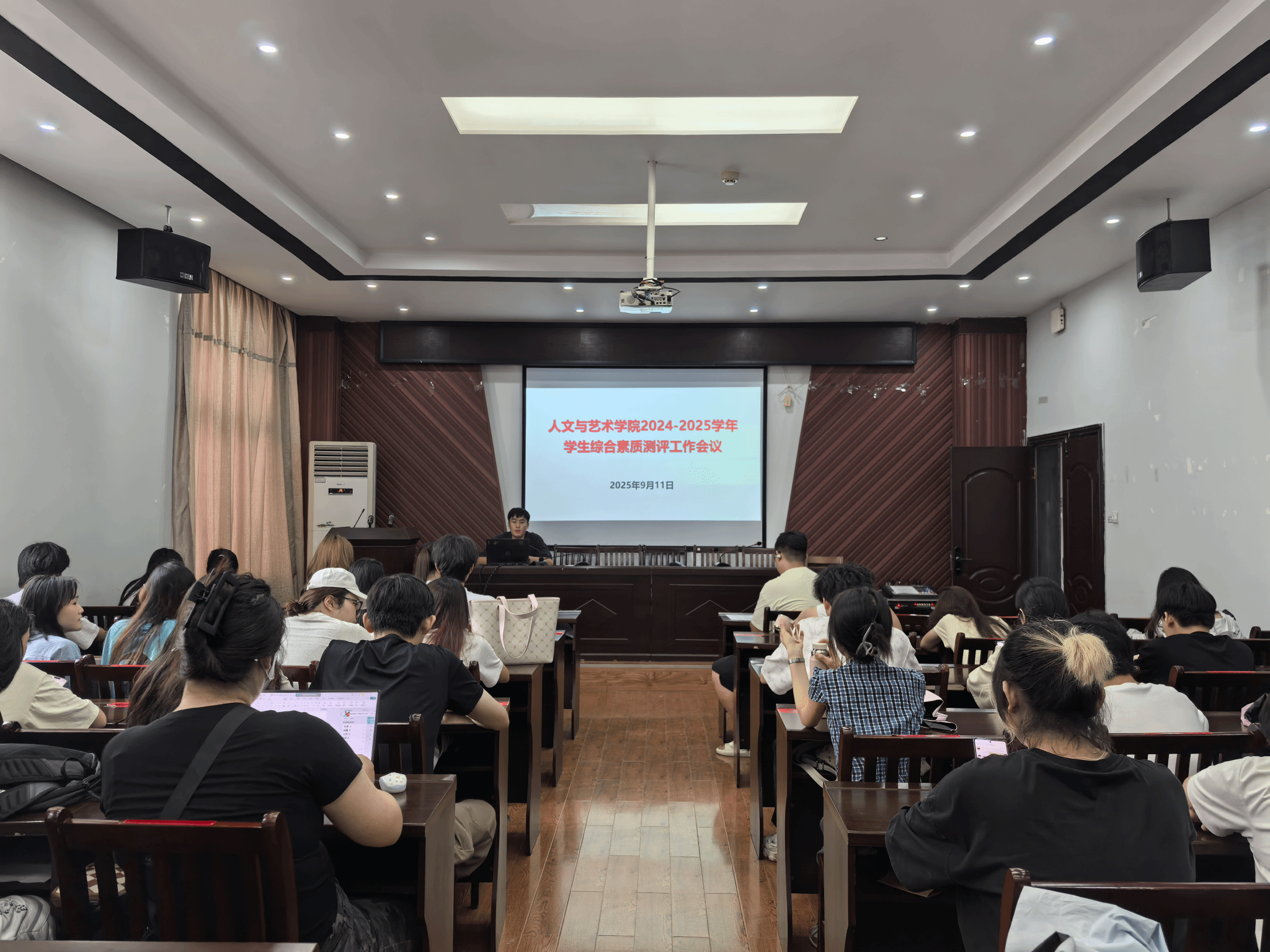 9月11日中午,人文与艺术学院组织召开2024-2025学年学生综合素质测评工作会议。学院辅导员以及2022至2024级全体班级班长及学习委员共计70余人参会。