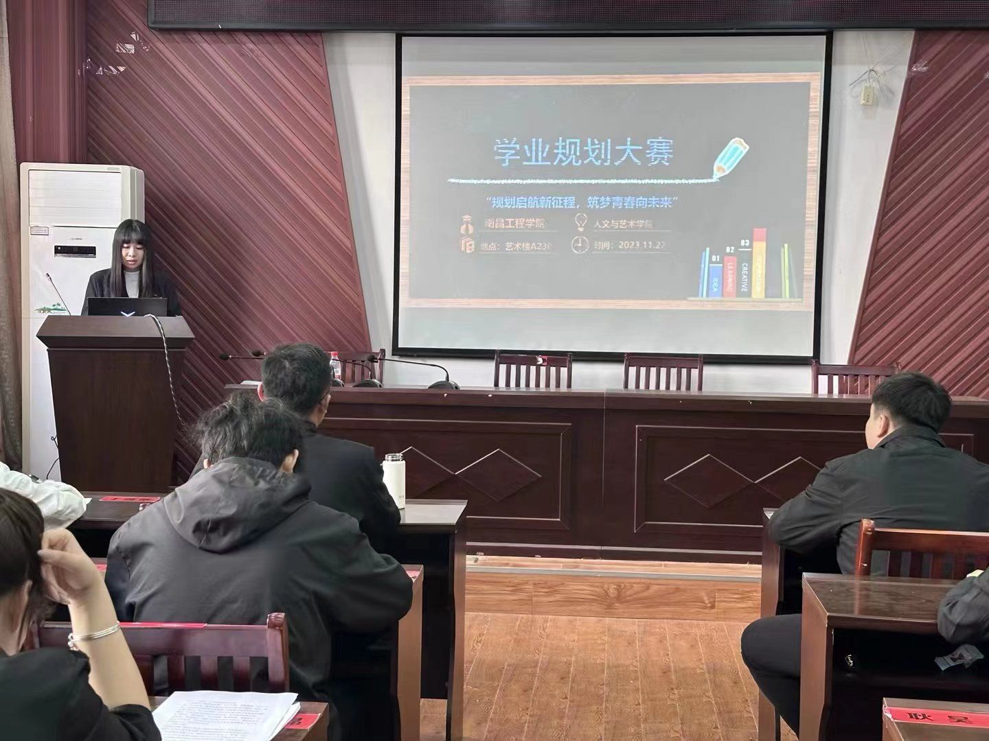 为了更好地实现以赛促学、以赛促教,引导大学生树立正确的成才观、就业观和择业观。人文与艺术学院于23年11月22日在艺术楼A230开展学业规划大赛。本次大赛由辅导员兰龙焱、马浩哲老师及分团委学生副书记赵文敏担任评委。
