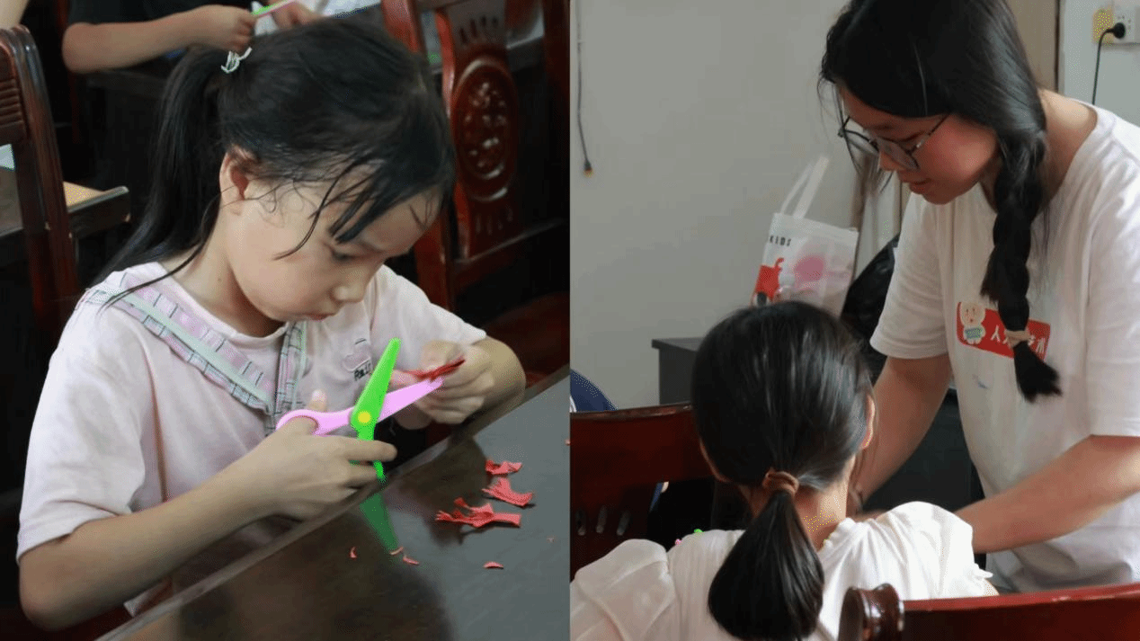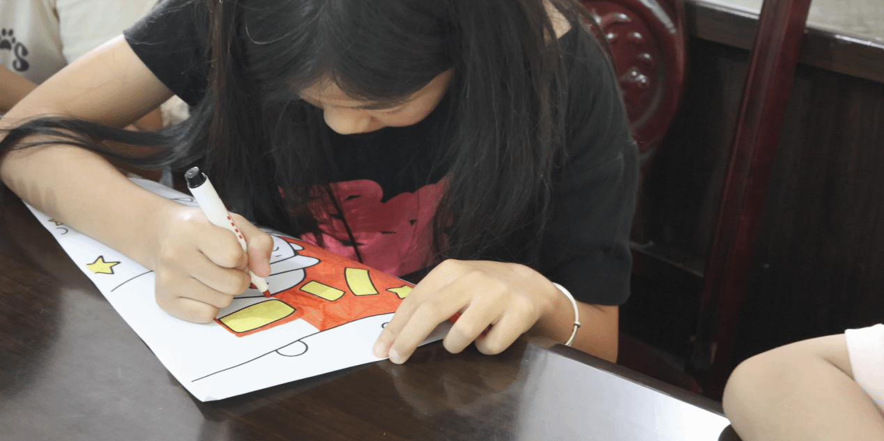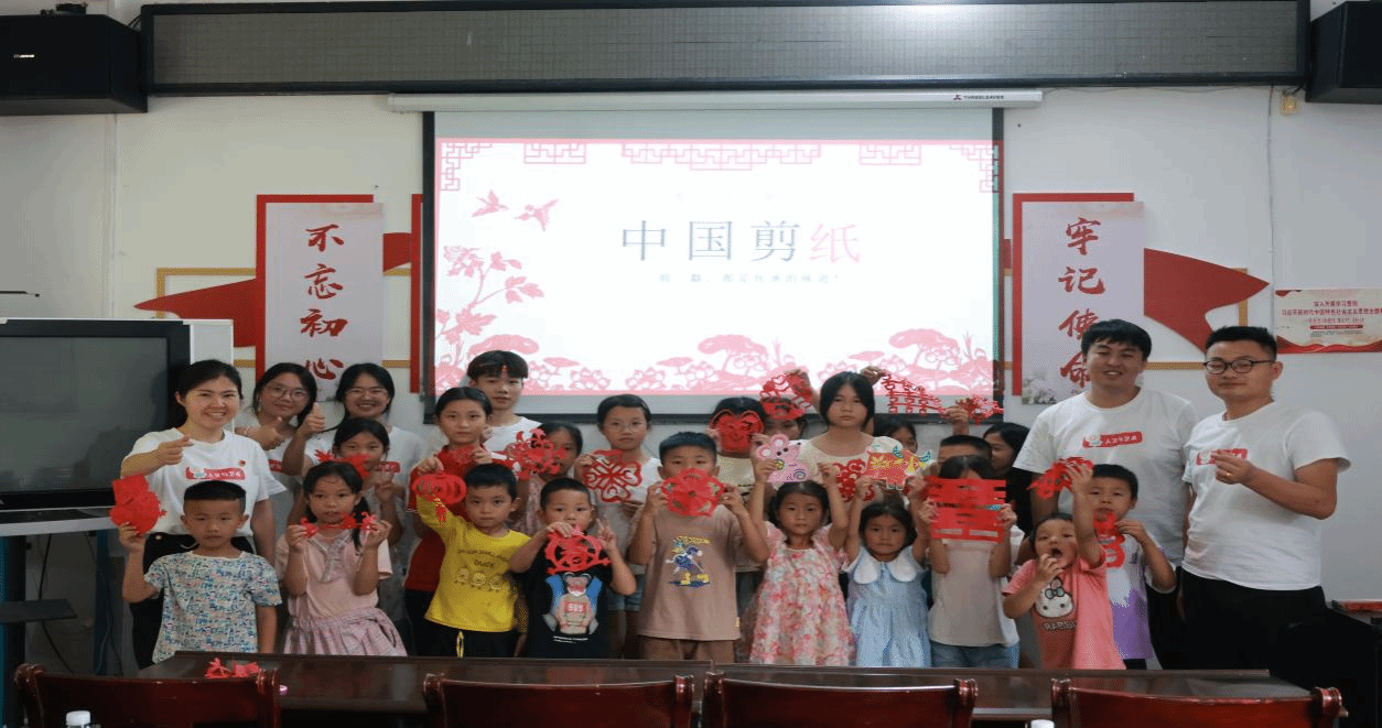 本次课程融入我院“一首歌一幅画一视频”“渠堤”党建特色品牌。在师生党员的带领下,孩子们唱响红色歌曲《万疆》,歌唱祖国的壮美山河与仁爱胸怀,抒发质朴真挚的爱国情怀;通过描绘“红色英雄”,追忆历史人物和故事,表达对英雄人物的赞美之情;师生党员还教孩子们亲手创作剪纸作品,体验扎染技艺,感受传统文化的魅力。